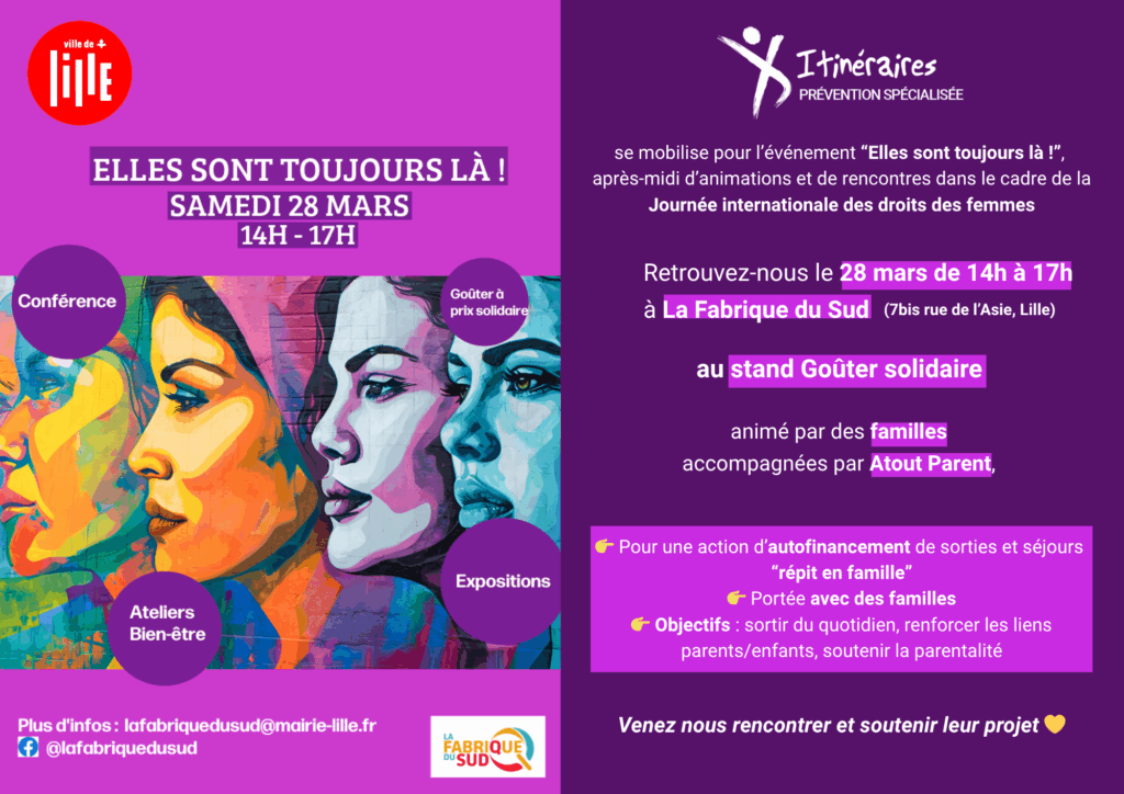 Samedi 28 mars, des mamans accompagnées par le dispositif Atout Parent d’Itinéraires ont participé à l’événement « Elles sont toujours là ! », organisé par la Ville de Lille à La Fabrique du Sud, dans le cadre de la Journée internationale des droits des femmes.