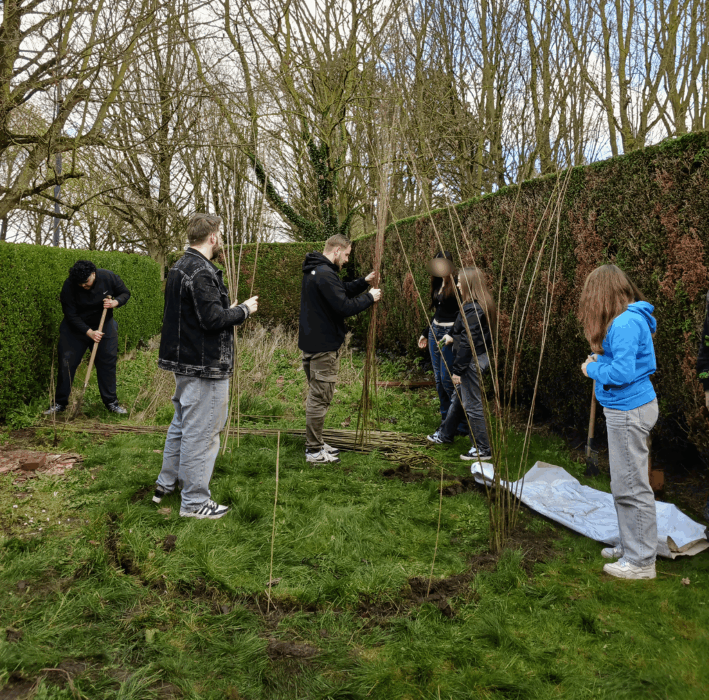 D’un côté, la plantation de petits fruitiers — groseilles, cassis et autres — qui porteront leurs premiers fruits dans les saisons à venir. De l’autre, la construction d’une cabane en saule tressé, technique vivante et ancestrale : les jeunes assemblent, courbent, nouent les tiges. Avec le temps, la structure se couvrira de feuillages et deviendra un véritable espace de vie, vivant et changeant au fil des saisons.